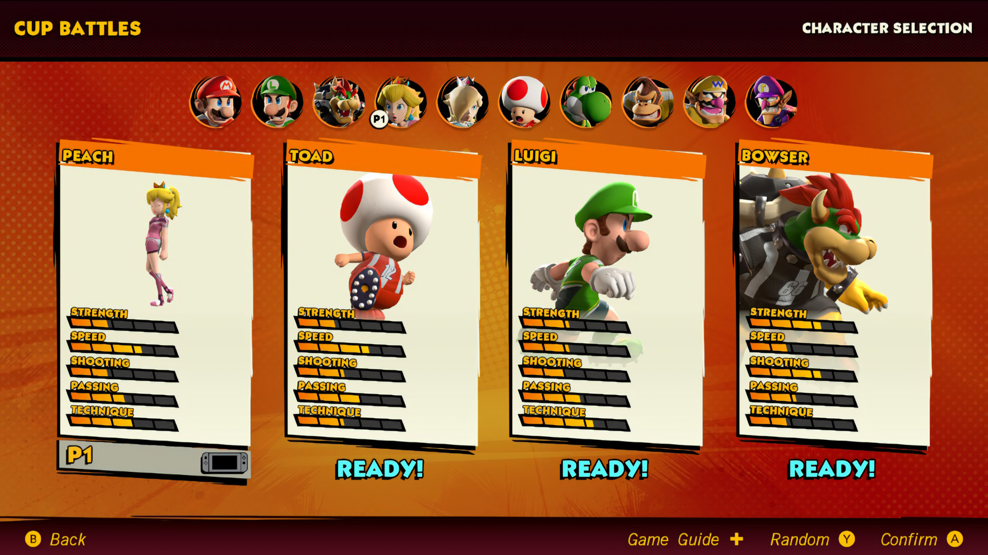 Mario Strikers Battle League character selection.